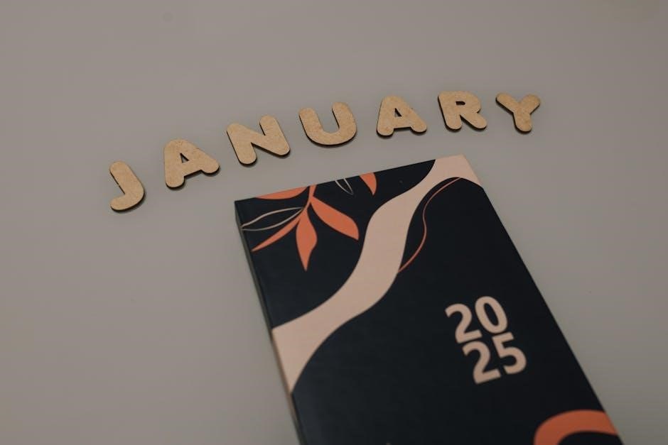To achieve the best printing results for your January 2025 calendar, use high-quality paper (80-100 gsm) for crisp text and vibrant colors. Ensure your printer settings match the paper size (A4 or Letter) and orientation (portrait). Choose the “Fit to Page” option for accuracy. For PDFs, select “Actual Size” in print settings. Use duplex printing for double-sided output. Adjust margins to minimize trimming. Preview the layout before printing to avoid errors. This ensures a professional and neat calendar for daily use.